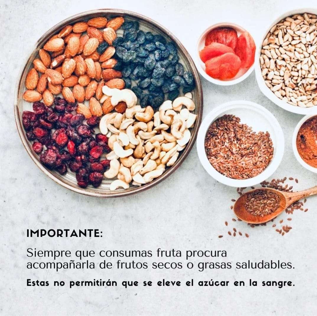 Al momento de consumir tu porción de fruta te recomendamos siempre comerla acompañado de una grasa natural, por ejemplo con frutos secos o yogurt griego. Estos logran que la glucosa no se eleve sino que se regule y nuestro indice glucémico sea bajo ❤️.