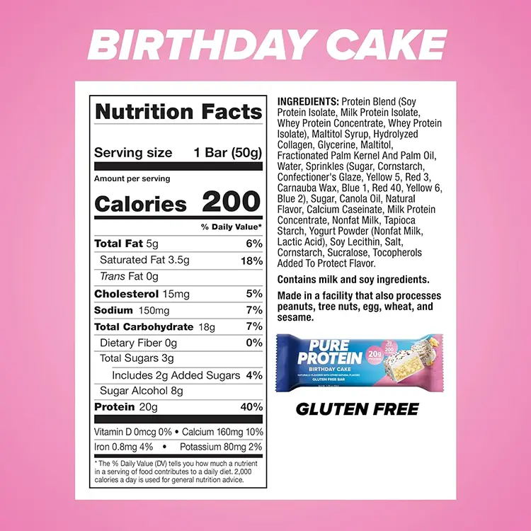 Disfruta la Barra de Proteína Pure Protein Birthday Cake 50g: un snack delicioso con sabor a torta de cumpleaños y alto contenido de proteína, ideal para apoyar tus músculos y darte energía mientras te das un gusto dulce en cualquier momento del día.