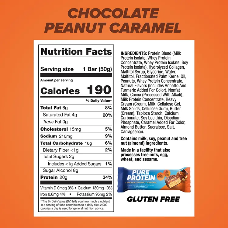 Disfruta la Barra de Proteína Pure Protein Chocolate Peanut Caramel 50g: una combinación irresistible de chocolate, maní y caramelo que te aporta alto contenido de proteína para apoyar tus músculos y darte energía, perfecta como snack práctico y delicioso en cualquier momento del día.