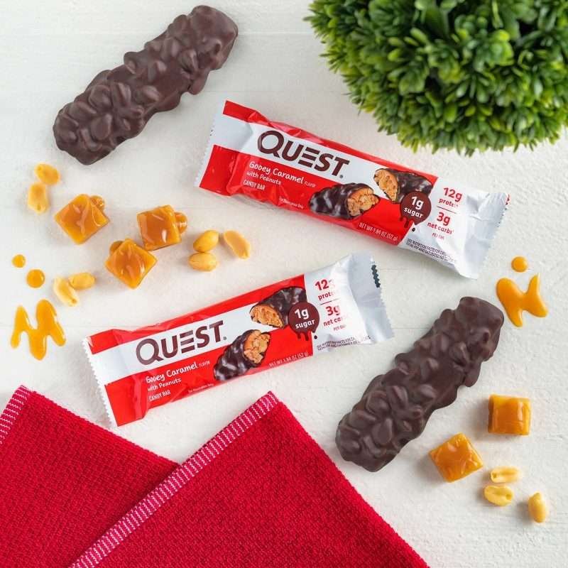 Barra de proteína aislada de suero de leche, rellena de caramelo y chocolate y recubierta con chocolate blanco.