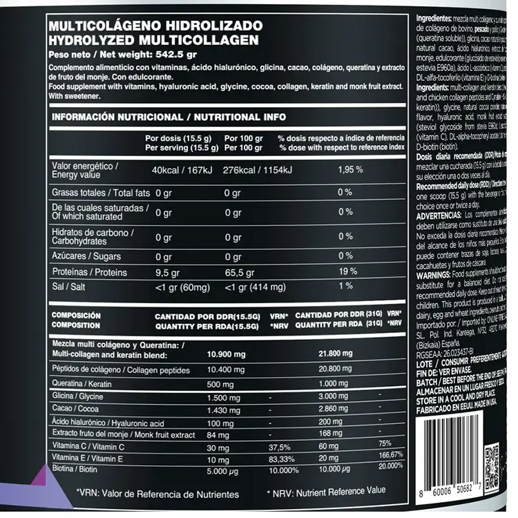Como suplemento dietético combine una (1) cucharada en su bebida o comida de elección una o dos veces al día. Puede añadirse con seguridad a cualquier tipo de bebida o receta. Asegúrese de mezclarlo bien. Los beneficios de la suplementación con Péptidos de Colágeno se sienten típicamente después de 30-60 días de uso continuado.